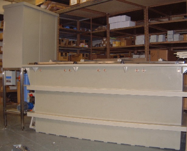 A large polypropylene electroplating tank, fitted with a stainless steel frame to hold the filter system and plating rectifiers